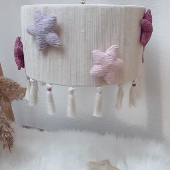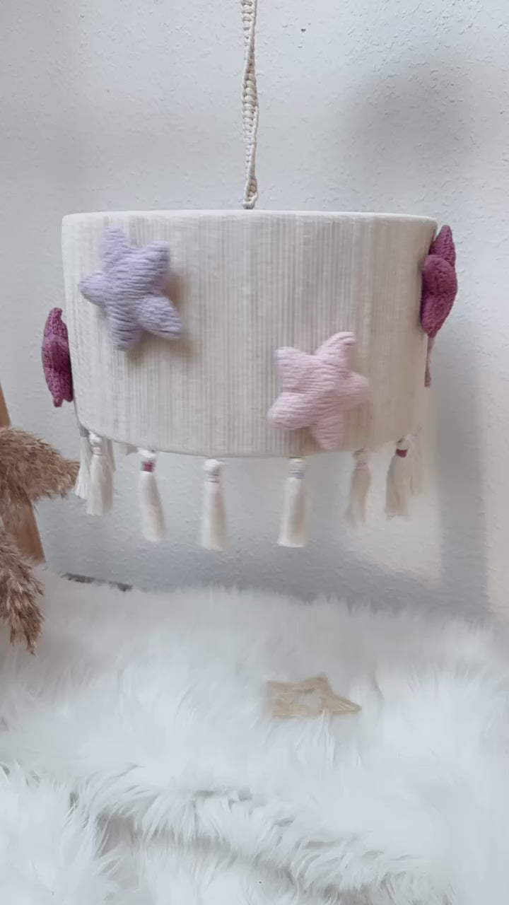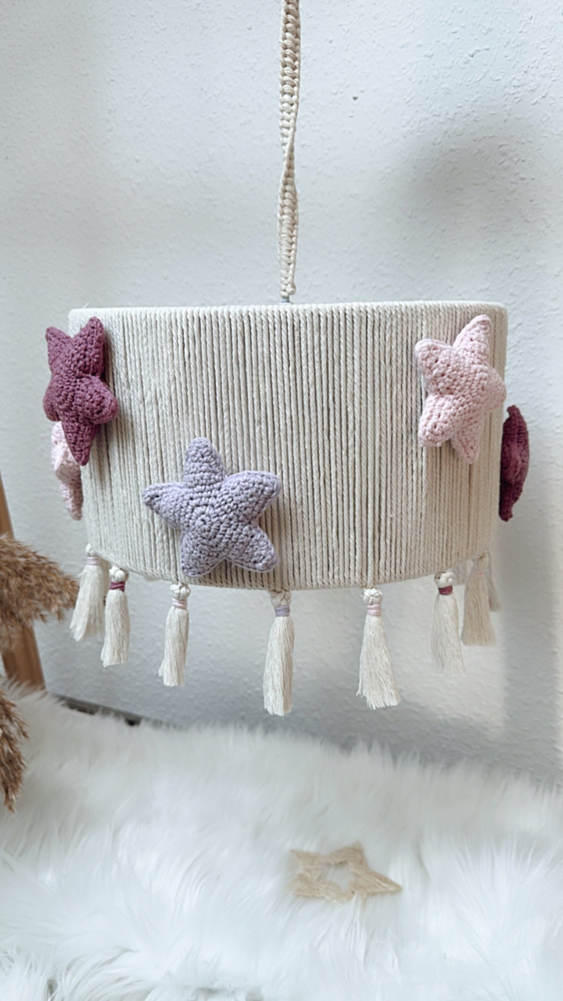 Unser liebevoll gefertigter Makramee-Lampenschirm bringt Wärme und Gemütlichkeit in jedes Kinderzimmer, Schlafzimmer oder Babyzimmer. Der natürliche Boho-Stil mit süßen gehäkelten Sternen verleiht jedem Raum eine zarte, verspielte Note.